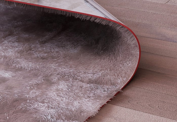 1.Правильно разложите ковер после покупки. Выровняйте напольное покрытие еще до укладки на пол, очистите и высушите. Проклейте все углы двусторонним скотчем и разложите палас на полу.