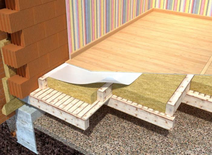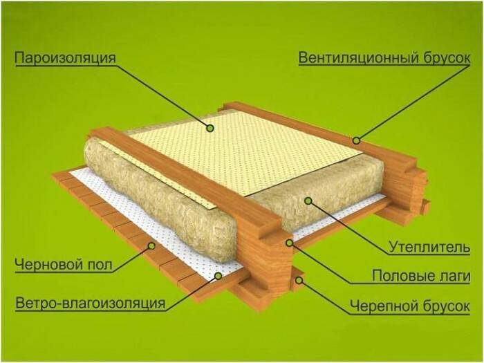 В России, как правило, утепляют традиционным способом. Снизу по лагам идет ветрозащита, в промежутках кладут утеплитель рулонного типа – 150-200, на него пароизоляцию или фольгу (отражайку), затем черновой пол и на него чистовой. Но в суровых климатических условиях это не спасет.