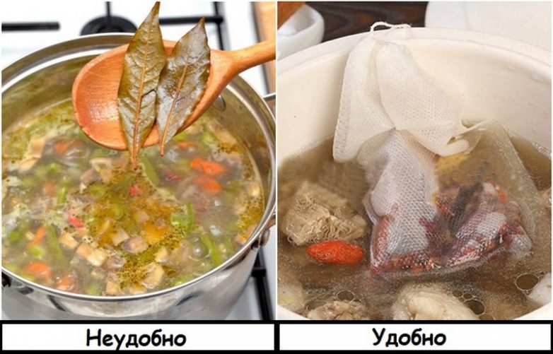 В процессе приготовления супа мы часто используем ингредиенты, которые могут оставаться в кастрюле, но не должны попадать в тарелку. Это перец горошком, лавровый лист, чеснок и пр. Облегчить себе жизнь можно при помощи специального мешочка, в который вы складываете специи, затем опускаете его в бульон, а когда суп будет готов – вытаскиваете и выбрасываете. Также этот мешочек можно использовать для заварки чая, чтобы в кружку не попадали чаинки.
