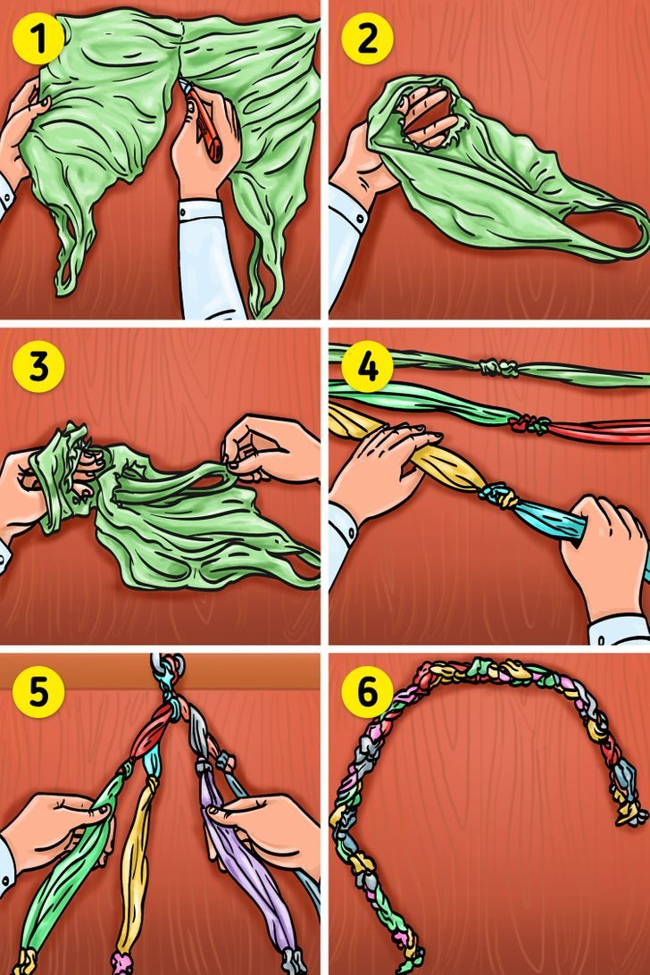 Необходимое количество пакетов зависит от желаемой длины веревки. Разрежьте пакет пополам в продольном направлении. Проделайте отверстие в нижней части каждой половинки. Пропустите одну половинку через отверстие второй, просуньте ее через ее же ручку и затяните.