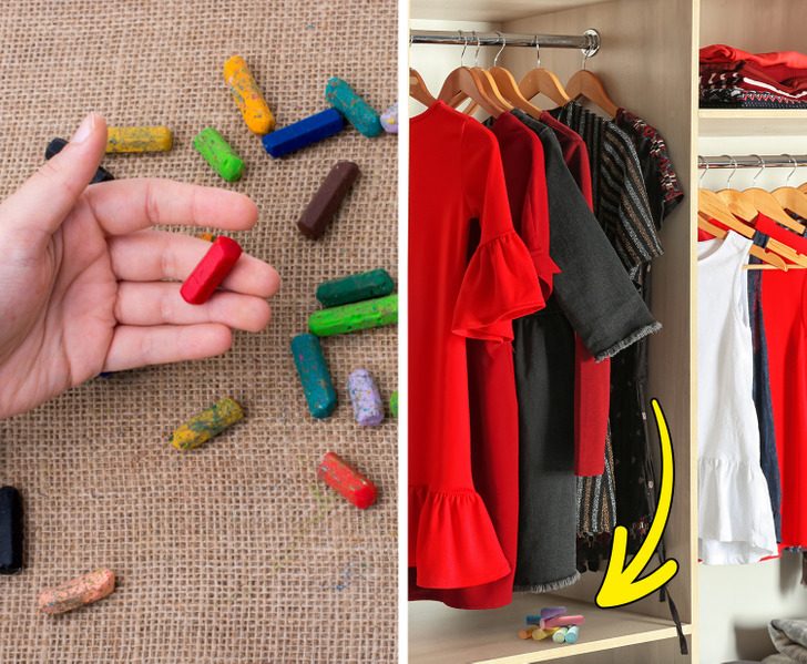 Мало кто знает об этом, но обычные детские мелки, которыми мы все когда-то рисовали на асфальте, могут освежить воздух в шкафу и предотвратить появление затхлости. Нужно всего лишь положить несколько кусочков на полку или в корзинку. Для ароматизирующего эффекта можно также добавить на мел пару капель эфирного масла.
