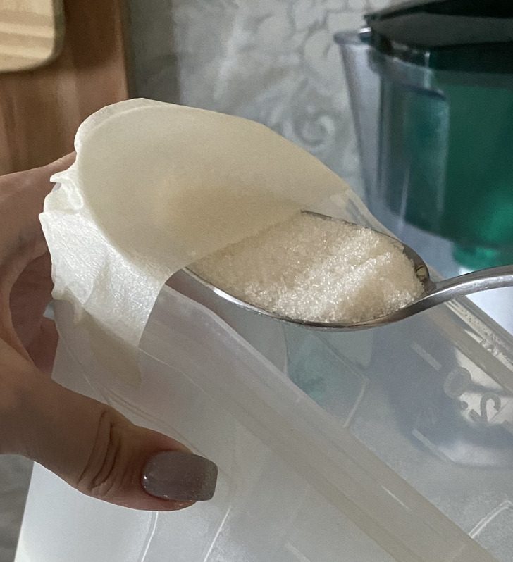 Чтобы легко смахнуть с ложки лишнее количество сахара, какао и так далее, приклейте с одного края контейнера полоску малярной ленты. Она будет служить скребком, благодаря которому можно будет без труда одной рукой зачерпнуть необходимое количество продукта. Кроме того, она достаточно тонка для того, чтобы легко надевать крышку прямо поверх нее.
