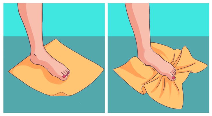 Сминаем пальцами полотенце. Сядьте, постелите полотенце под ногу, скомкайте его пальцами, а затем расправьте. Если болезненные ощущения присутствуют в обеих стопах, повторите упражнение несколько раз одной ногой, а затем другой.