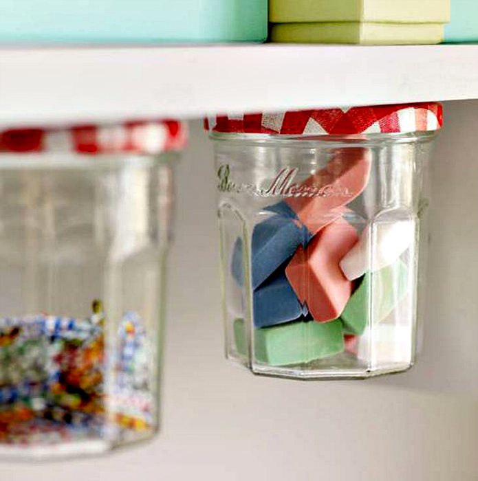 Банки, прикрученные или приклеенные крышками к полке или подвесному шкафчику, прекрасно подойдут для хранения биндеров, скрепок, кнопок, ластиков и прочих мелочей.