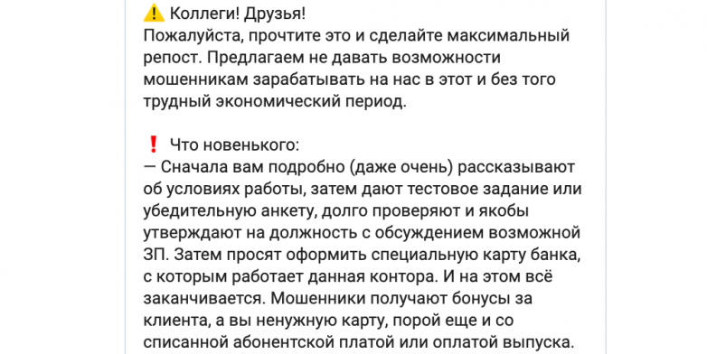 Вы отправили резюме, ответили на вопросы, хорошо сделали тестовое задание. Ура, вас берут в команду, но есть одна мелочь. В этой организации зарплату переводят только на карту конкретного банка, а у вас такой нет.Вам дают ссылку на страницу банка, но, когда карта готова и с вас уже списали деньги за оформление или обслуживание, работодатель исчезает. И вы понимаете, что сотрудника никто и не искал. Мошенник просто использовал вас, чтобы получить от банка деньги по партнёрской программе.