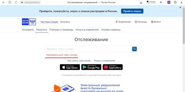Такой ответ выдаст сайт «Почты России», если трек-номер настоящий, но посылка не отправлена