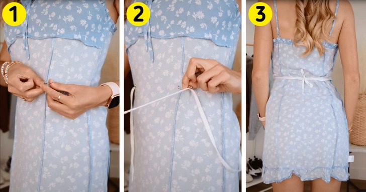 Подгонка вещей по размеру обходится недешево, к тому же вес человека может колебаться. Вот почему стоит научиться делать это самостоятельно. Выверните платье наизнанку и прикрепите 2 булавки с обеих сторон талии. После этого проденьте шнурок через булавки и выверните платье обратно. Теперь ваше платье будет сидеть по фигуре.