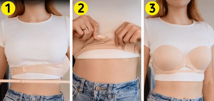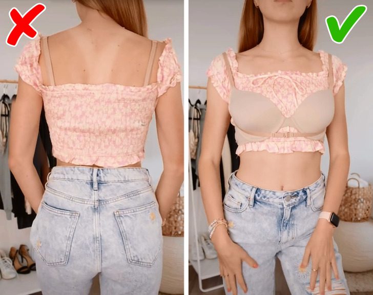 Если вы не хотите, чтобы бретельки бюстгальтера были видны, когда вы надеваете топ с открытой спиной, вам пригодится этот способ. Просто отсоедините бретельки на спине и соедините впереди, под бюстгальтером. Теперь у вас нет необходимости покупать бюстгальтер без бретелек, и никто их не увидит.