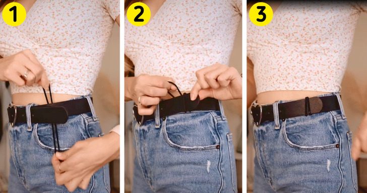 Если у вас слишком длинный ремень и его кончик сильно торчит, возьмите резинку для волос того же цвета, что ремень. Заправьте ее под ремень, соедините один конец с другим и накиньте на болтающийся кончик ремня.