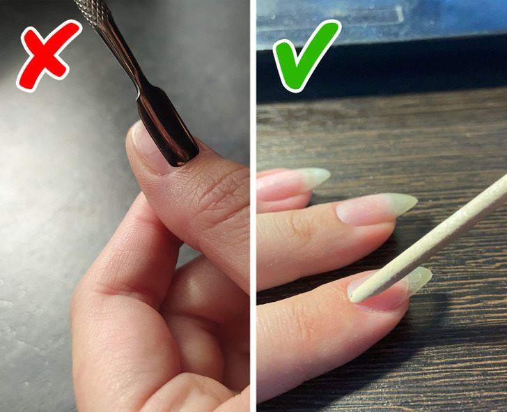 Отодвигать кутикулу необходимо, но, не будучи профессионалом, металлическими инструментами можно случайно повредить и ноготь, и кожу вокруг него.