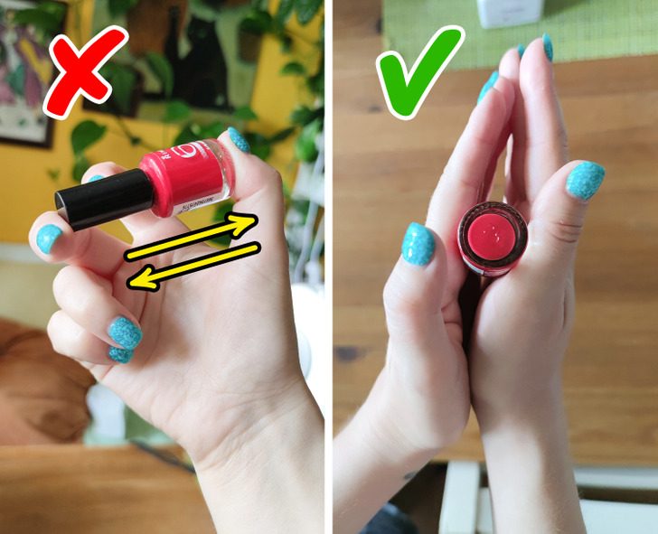 Если лак долго стоял, его нужно перемешать, прежде чем красить ногти. И мы привыкли трясти его, чтобы шарики внутри застучали, но, оказывается, так лучше не делать. Встряхивание приведет к тому, что в лаке образуются пузырьки воздуха, а после нанесения «всплывут» на свежем покрытии и все испортят.