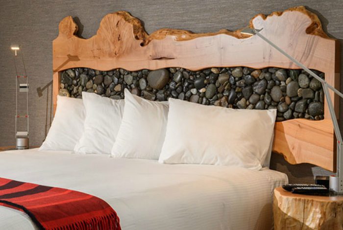 Натуральное дерево и речная галька — прекрасные материалы для креативного оформления изголовья кровати.