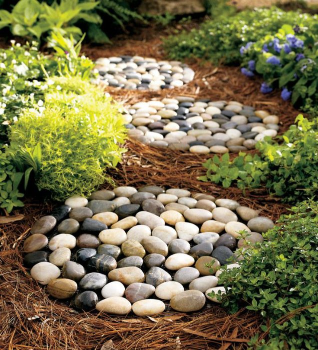 Блины из гальки можно использовать для создания креативной садовой дорожки.