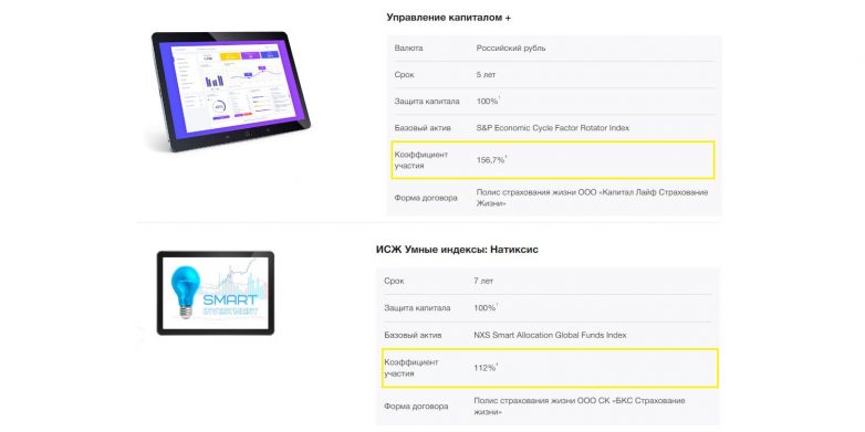 Страховая компания отдаст не все деньги, которые заработает на инвестициях, — какой‑то процент заберёт себе как вознаграждение. Большая часть дохода достанется владельцу полиса, её называют «коэффициент участия». Обычно последний равен 80–95% от прибыли. Но иногда страховые компании обещают коэффициент участия выше 100%.