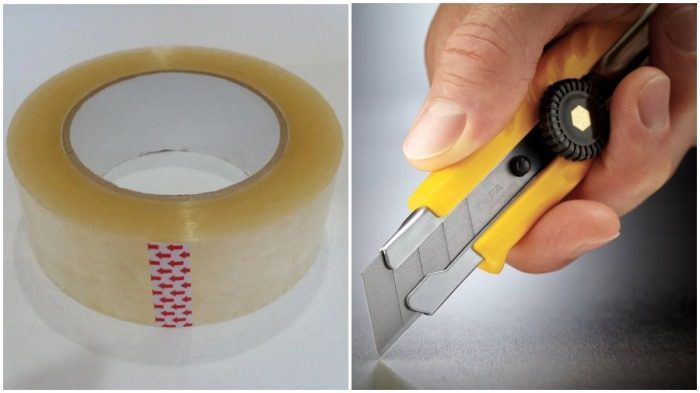 Понадобятся для этого только скотч и простой канцелярский нож. На вмятину наклеивается широкий скотч полосками. Сначала вертикально три полоски, затем сверху еще такое же количество.