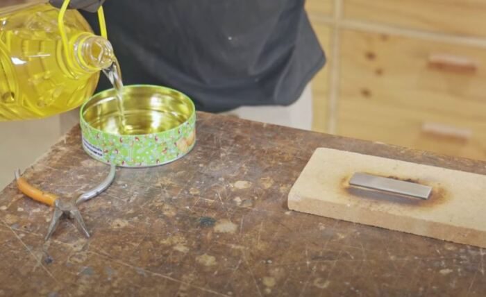Основательно нагреваем металлическое изделие так, чтобы оно стало серого цвета. Сразу после этого быстро протираем нашу заготовку тряпочкой, пропитанной льняным маслом. Еще лучше будет окунуть деталью в емкость с маслом полностью. После извлечения остатки масла вытираются и выжигаются. В итоге получается идеально ровное черное воронение.