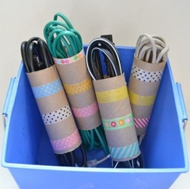 Простые картонные чехлы помогут держать все провода в порядке. А цветная лента сделает их непохожими друг на друга.