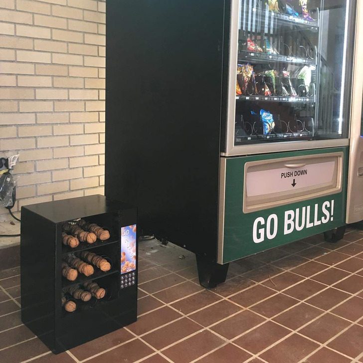 На импровизированном автомате висит предупреждение: «Внимание! Может содержать орехи».