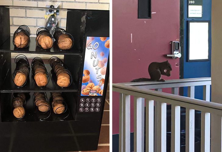 1. «На работе у моей девушки стоит автомат с закусками, из которого белки воровали еду. Один из сообразительных студентов творческого факультета нашел решение»