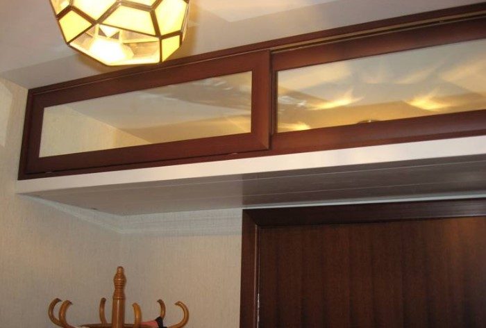 Еще во время ремонта можно спроектировать специальные ниши, которые будут гармонировать с потолком. Они выглядят как дополнительный монолитный или разборный ярус. Ниши могут быть открытыми, закрытыми или комбинированными, но большей популярностью пользуется второй тип. Под конструкцией можно установить небольшие светильники или прикрепить светодиодную ленту. Обычно подобные ниши делают в коридорах, прихожих или кладовых. Подходящие места: над дверью, в уголке, по периметру помещения, вдоль одной из стен. К преимуществам стоит отнести вместительность, декоративность и практичность. Если в квартире имеются уже готовые ниши, их можно задействовать по максимуму. Среди недостатков: громоздкость потолка и труднодоступность. В первом случае важно замаскировать конструкцию под потолок или стены, чтобы она не бросалась в глаза. Во втором — распределить вещи по контейнерам, коробкам, чтобы проще находить нужные предметы.