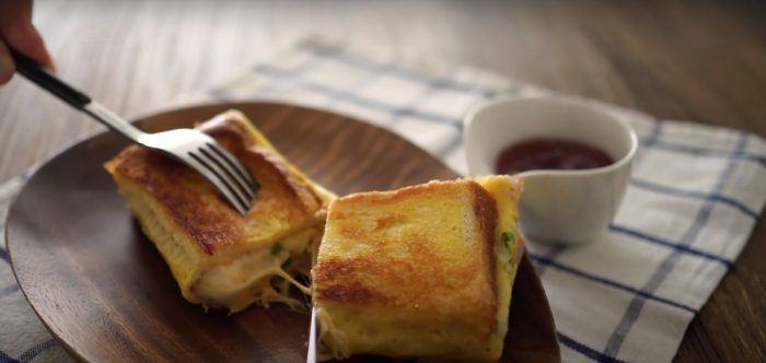 Получится своеобразный тост, внутри которого окажется расплавленный горячий сыр и другие сытные ингредиенты.