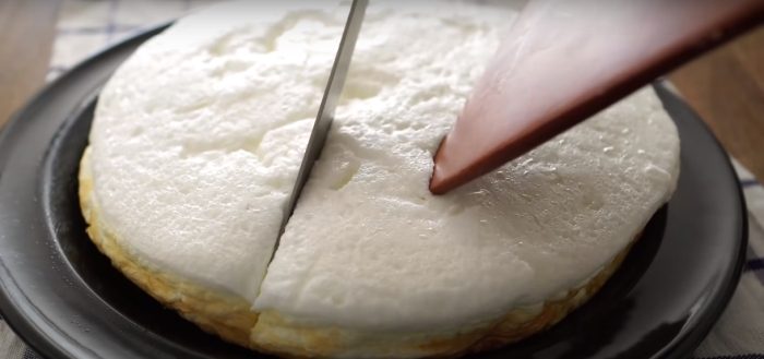 Очень оригинальный рецепт, в результате которого получается красивое и вкусное блюдо. Для начала понадобится шесть яиц. Желтки нужно отделить от белков. К желткам добавляем одну чайную ложку сахара и тщательно взбиваем вилкой. Аналогичную процедуру повторяем и для белков, только к ним добавляем три ложки сахара. Сначала взбиваем их вручную, а затем доводим до состояния густой пены с помощью миксера. Затем сковороду смазываем маслом и выливаем желтки. Сверху на образованный блин аккуратно выкладываем белковую пену и закрываем крышкой. Доводим до готовности так, чтобы нижняя сторона была слегка подрумяненной, а верхняя прочно схватилась.
