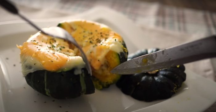 Для приготовления этого оригинального блюда необходимо взять несколько тыкв маленького размера. Сначала подогреваем их в микроволновой печи, чтобы доставать и них семечки было гораздо проще. В подготовленную тыкву засыпаем нарезанный мелкими кусочками сыр моцарелла, сверху разбиваем яйцо, желток которого нужно аккуратно проколоть, сверху еще слой сыра, потом слой измельченного лука, а затем слой ветчины. Слои необходимо повторять, пока тыква не заполнится полностью. Каждый слой нужно слегка присаливать и перчить. Сверху тыкву закрываем двумя кусочками тостового сыра. Готовится блюдо на обычной тарелке в микроволновой печи. Тыква накрывается пластиковым контейнером, чтобы хорошенько пропаривалась. Готовность определяется зубочисткой: тыква должна быть мягкой.