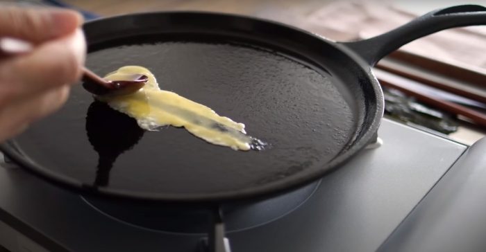 Когда все шарики будут готовы, на разогретую сковороду с маслом выкладываем тонкую полоску нори и сверху поливаем ее взбитыми яйцами. Яичная полоска должна быть раза в три четыре шире, чем полоска нори. Когда яйцо немного схватится, на его край кладем шарик и заворачиваем. Немного ждем, чтобы край зафиксировался, а потом выкладываем на блюдо.