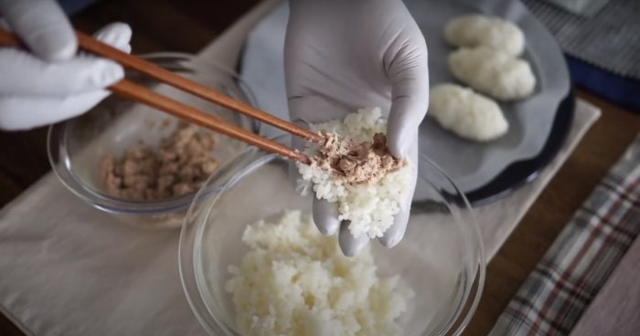 Для начала нужно смешать 150 грамм консервированного тунца в собственном соку с небольшой порцией майонеза и тщательно перемешать. В отдельную емкость разбить 3-4 яйца и добавить половину чайной ложки соли, смешать. Также отдельно необходимо приготовить пропаренный рис, подсолить его в процессе готовки или уже непосредственно при смешивании с кунжутным маслом. На полтора стакана риса понадобится 1 чайная ложка масла. Затем приступаем к формированию шариков: на руку кладем небольшую порцию риса, разравниваем и сверху добавляем немного тунца и закрываем начинку. Можно делать шарики или продолговатые котлетки.