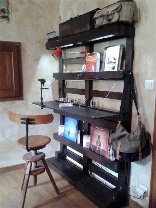 Из паллет также несложно создать стеллажи, нужно только немного терпения и фантазии. Такая конструкция с открытыми полками удобна для хранения многих предметов и можно еще добавить откидную доску – она послужит рабочей поверхностью вместо стола.