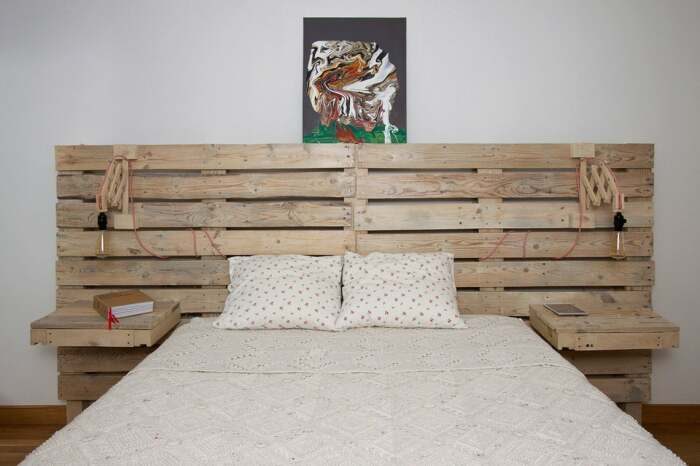 С помощью поддонов не составит труда привнести в спальню деревенский шик, соорудив из них изголовье кровати. Самый простой вариант – это сбить вместе пару блоков. Для более продвинутых конструкций можно вмонтировать светильники, и добавить полочки. Такое изголовье будет не только функциональным элементом, но и станет ярким акцентом интерьера.