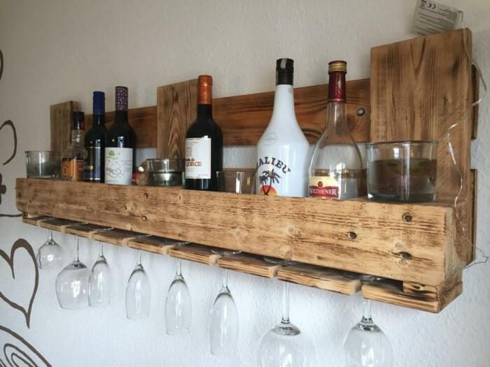 Еще одна интересная идея – винная полка из поддонов. Ее можно сделать любых размеров и формы, соответственно интерьеру помещения, главное, чтобы дерево было крепкое и выдержало тяжесть бутылок. Для большей эстетичности полку можно покрасить лаком или сделать какую-то тематическую надпись. Красивая поделка не просто будет удобна для хранения, она станет «изюминкой» интерьера.