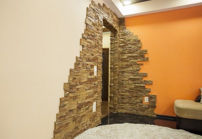 Для этой области подходят большие массивы камня. Проход, оформленный грубой кладкой, гармонично контрастирует со светлым фоном стен и расставляет акценты. Искусственный камень выполняет не только декоративную, но и защитную функцию, поскольку уберегает дверной проем от изнашивания.