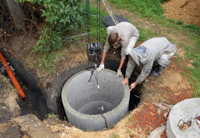 1. Яма из бетонных колец — чтобы построить резервуар, понадобится специальная техника. Нужно вырыть котлован, залить дно бетоном, а сверху на него установить бетонные кольца.