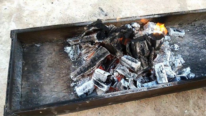 Укладываем поленца вперемешку с бумагой в мангал, сверху поливаем горючей жидкостью и поджигаем. Дожидаемся того момента, когда все дрова прогорят и распределяем древесный уголь по всему мангалу.