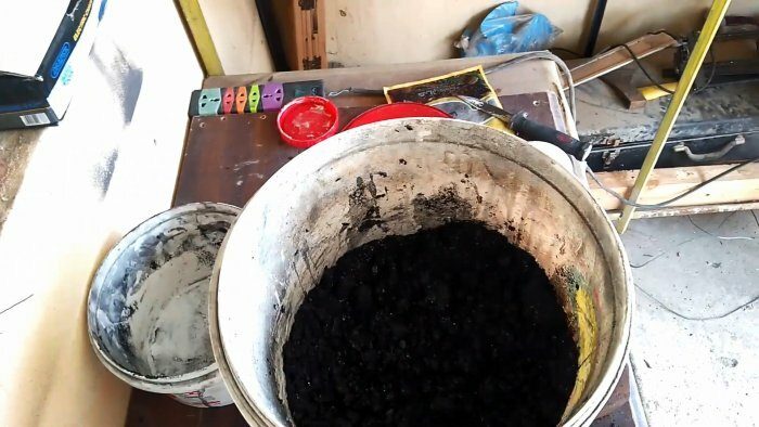 Загружаем порционно древесный уголь в блендер и превращаем его в порошок. Добавляем к нему 0,5 кг пищевого крахмала и оба компонента тщательно перемешиваем в емкости. Затем постепенно вливаем в полученную гомогенную смесь 1 литр воды и также хорошо перемешиваем.
