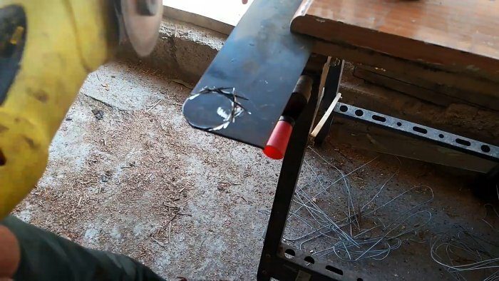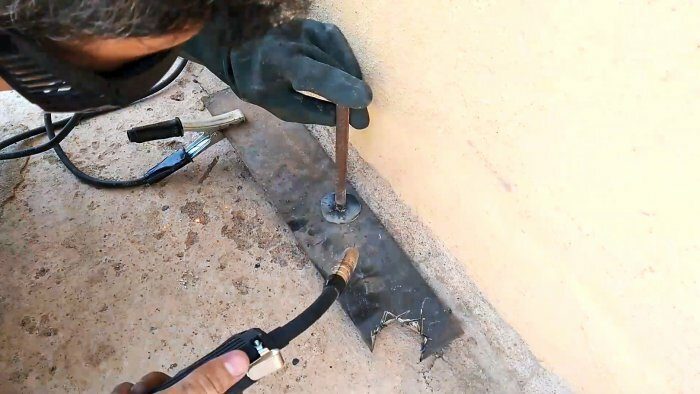 Из остатка небольшого листового металла вырезаем с помощью болгарки круг, обрабатываем края и к его центру вертикально привариваем небольшой отрезок арматуры или прутка. Этот круг должен свободно входить в отрезок круглой трубы заданной длины.