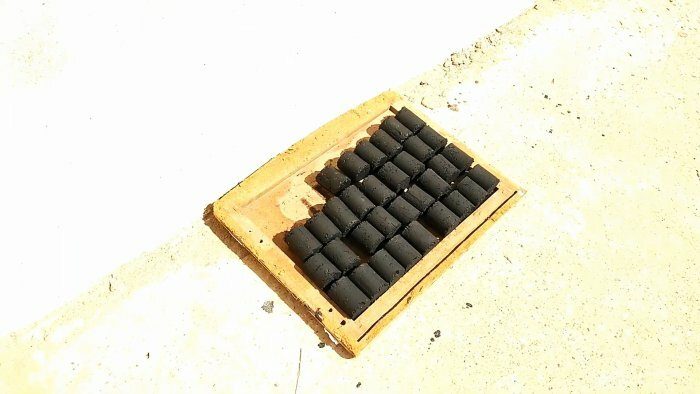 Брикеты укладываем на некотором удалении друг от друга на основание с бортами и оставляем на солнце до полного высыхания. После сушки общий вес брикетов составил 2,2 кг спрессованного древесного угля.