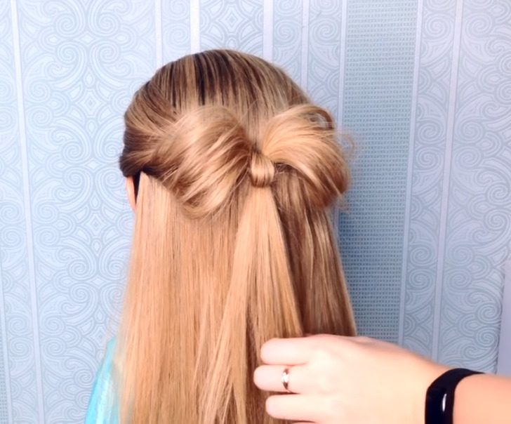 Заведите пряди назад, на затылок. Завяжите их резинкой в хвостик, а кончик хвоста протяните вниз между прядями над резинкой. Аккуратно вытяните перекрученные пряди из резинки, чтобы они выглядели как бантик.
