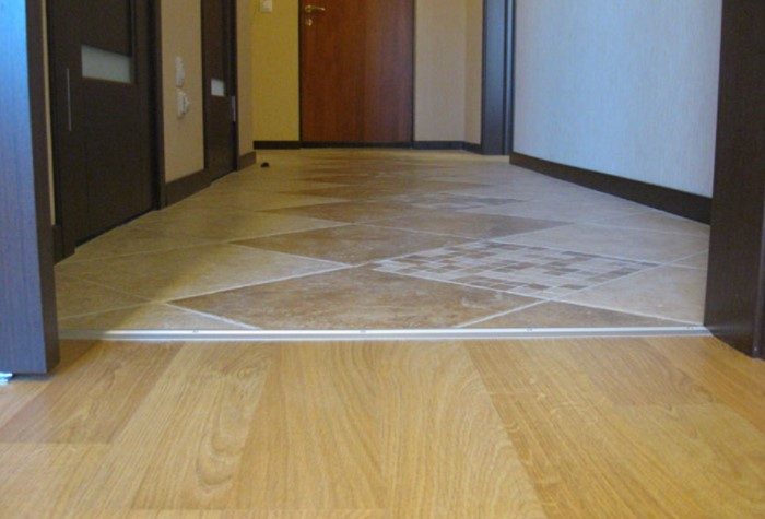 Вариант, с помощью которого прикрывают прямолинейные стыки и соединения сложной формы. Не забывайте, что под влиянием температур материалы могут расширяться и сужаться, поэтому оставьте под порожком небольшой зазор. Также позаботьтесь, чтобы плитка и ламинат располагались на одном уровне, иначе соединить их ровно не получится. Существует несколько средств для заделки стыков без порожка.
