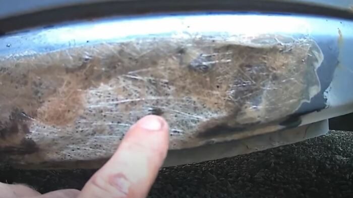 Сделав кожух из стекловолокна, осуществляем его полировку. В этом деле нам поможет все та же болгарка с лепестковым диском. Удалив все перепады наносим на поверхность шпатлевку, ждем высыхания и обрабатываем место ремонта наждачной бумагой, после чего наносим финишную шпатлевку. Вновь беремся за шлифовку. Добившись ровной поверхности, наносим на нее антигравий.