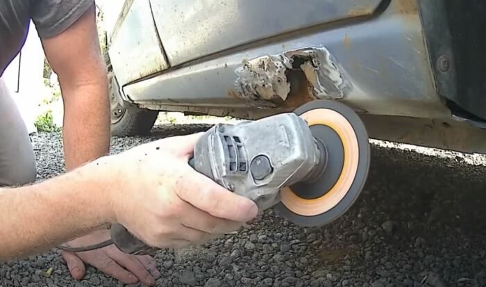 Первым делом необходимо обработать поврежденный коррозией участок порога. Для этого используем болгарку с лепестковым кругом и абразивные средства. Далее берется в руки молоток, с его помощью методом совершения ударов по источенному металлу повышает жесткость зачищенной поверхности.