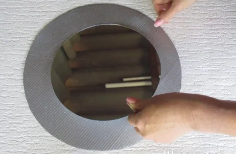 От автора канала «Шкатулка поделок»: Картон часто меня выручает, даже в декоре с зеркалом он снова мне пригодился. На днях купила зеркало и переделала его так, как нравится мне. Для начала я извлекла зеркало. После взяла картон, на нем обрисовала зеркало и к этому кругу прибавила еще круг (ширина между ними 5 см). Затем вырезала круг.