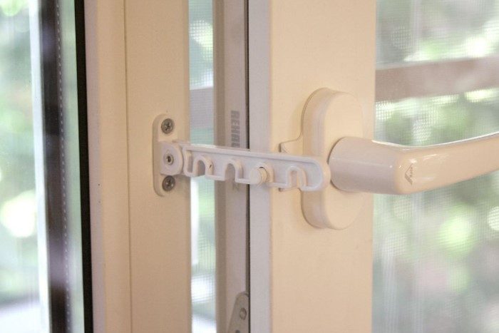 Если в доме есть маленькие дети, позаботьтесь о дополнительной безопасности и установите специальные замки на створки. Существует множество разновидностей подобных изделий, которые отличаются по типу установки и запорным механизмам. Главная функция детского замка — ограничить распахивание окна при проветривании, чтобы ребенок ни в коем случае не выпал.