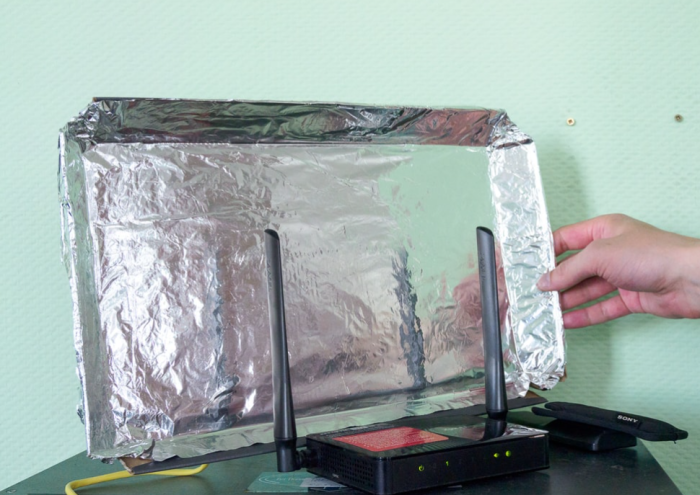Фольга работает и как усилитель сигнала Wi-Fi. Для этого нужно небольшой кусочек картона обернуть фольгой и закрепить его на антенне роутера при помощи резинки.