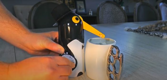 Очень часто бывает, что мы кладем в кружку пакетик чая, заливаем его горячей водой и потом уходим по своим делам, ожидая пока он заварится. Однако не менее часто случается так, что момент приготовления идеального по крепости чая упускается и пить его становится уже не так приятно. Чтобы избежать такого упущения, можно воспользоваться помощью забавного пингвинчика. С помощью поворотного механизма он заводится на определенное время, одновременно чайный пакетик опускается в чашку. Когда время выходит, пакетик автоматически поднимается и звучит сигнал о том, что чай готов.