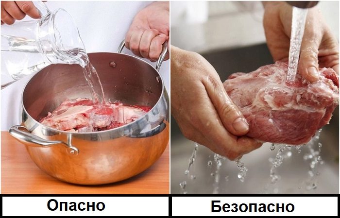 Самый безопасный вариант – аккуратно промывать продукты под проточной водой, чтобы брызги не разлетелись по всей кухне. Так вы точно будете уверены в том, что попрощались с бактериями навсегда. Также можно промокнуть мясо бумажным полотенцем.