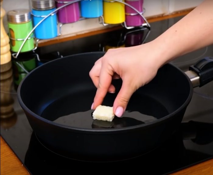 Когда еда для приготовления попадает на разогретую сковородку, зачастую масло начинает стрелять брызгами во все стороны. С такой опасностью высок риск обжечь кожу или даже, что брызги попадут в лицо. Чтобы этого избежать, можно попробовать простой, но действенный лайфхак: положить на сковородку с разогретым маслом небольшой кусочек мякоти белого хлеба. Поместить его лучше всего на середине сковороды.