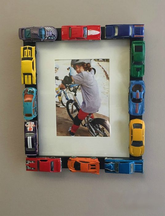 Поломанные или просто ненужные машинки можно использовать в качестве яркого и необычного декора для рамок с детскими фотографиями.