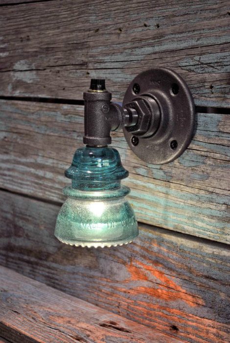 Украсить прихожую можно с помощью миниатюрных светильников, сделанных из стеклянных изоляторов и металлических водопроводных труб.